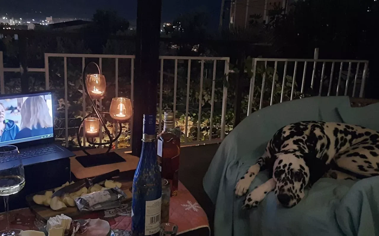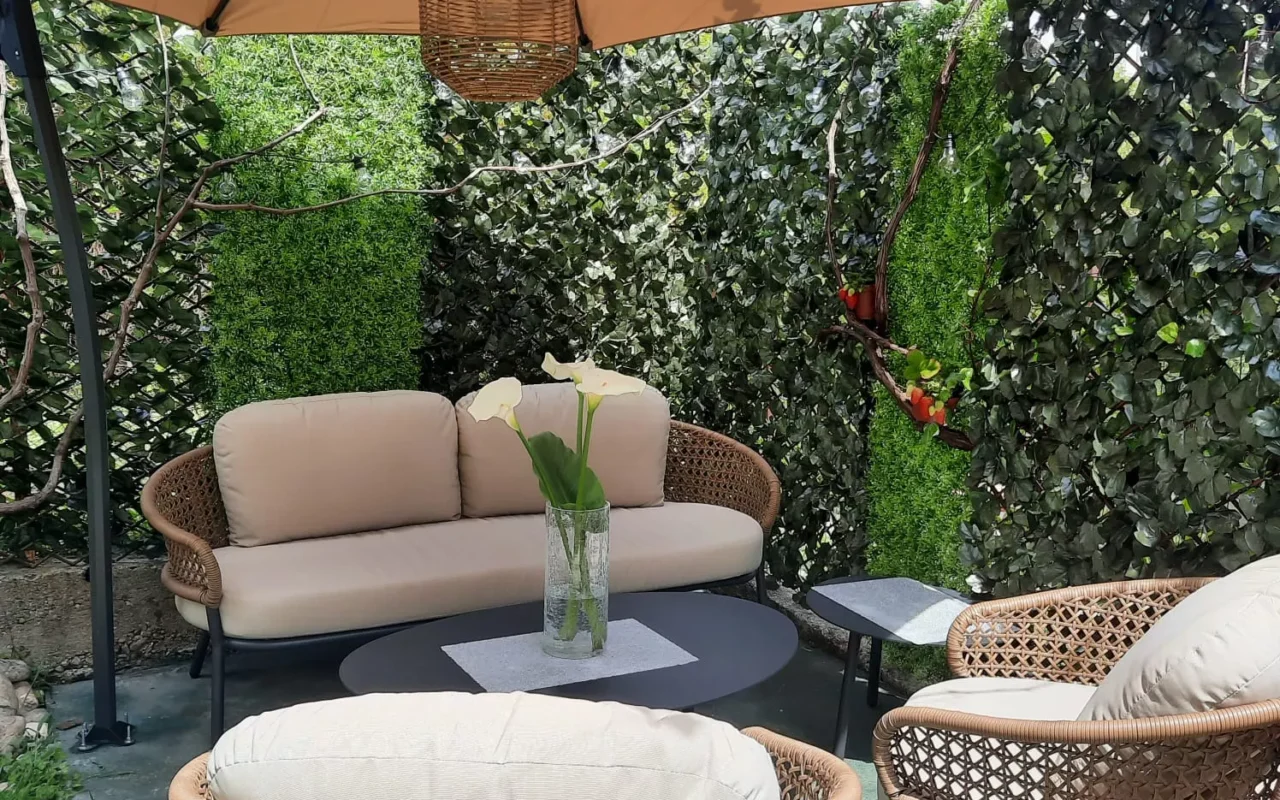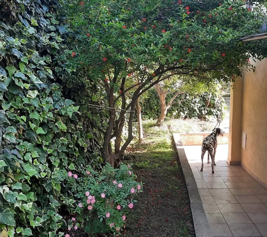 Auf dem Gelände wachsen Obstbäume: Granatapfel, Kaki, Feigen, Weintrauben, viel Schatten,