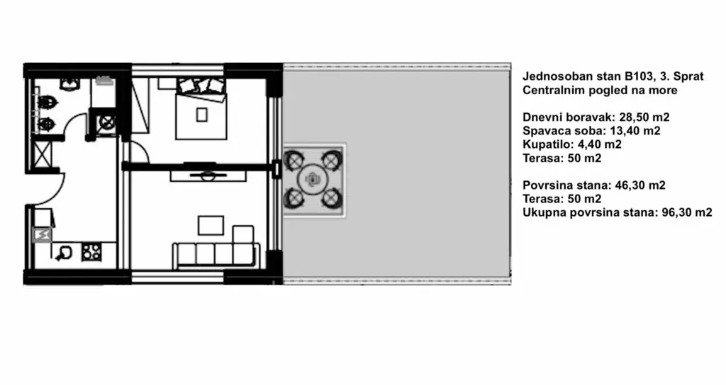Die Wohnung befindet sich im 3. Stock, Wohnfläche 46,30 m2 + 50 m2 Terrasse (Gesamtfläche: 96,30 m2). Die Wohnung verfügt über ein geräumiges Wohnzimmer mit Essbereich und Küche, ein Schlafzimmer, ein Badezimmer und eine großzügige Terrasse mit zentralem Meerblick, auf der ein Swimmingpool mit Whirlpool installiert werden kann.