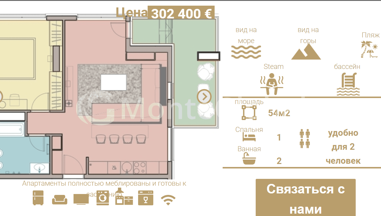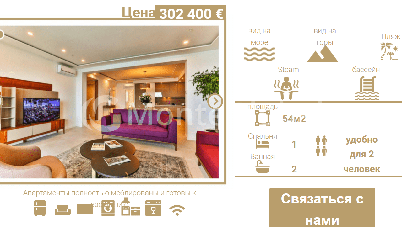 Das Gebäude besteht aus 12 Etagen und beherbergt Apartments unterschiedlicher Größe mit Blick auf das Meer und die Berge. Die Fläche der Wohnungen beträgt 54 m2 bis 110 m2. Beim Bau des Gebäudes wurden modernste und hochwertigste Bau- und Ausbaumaterialien verwendet.