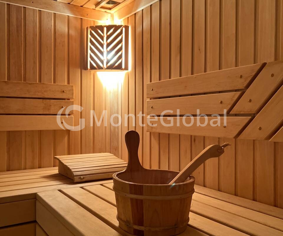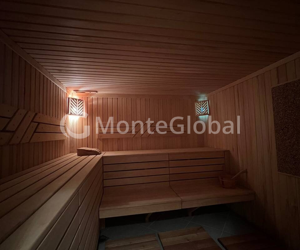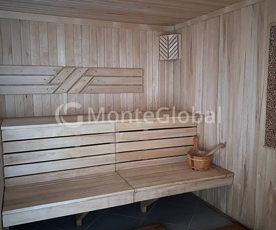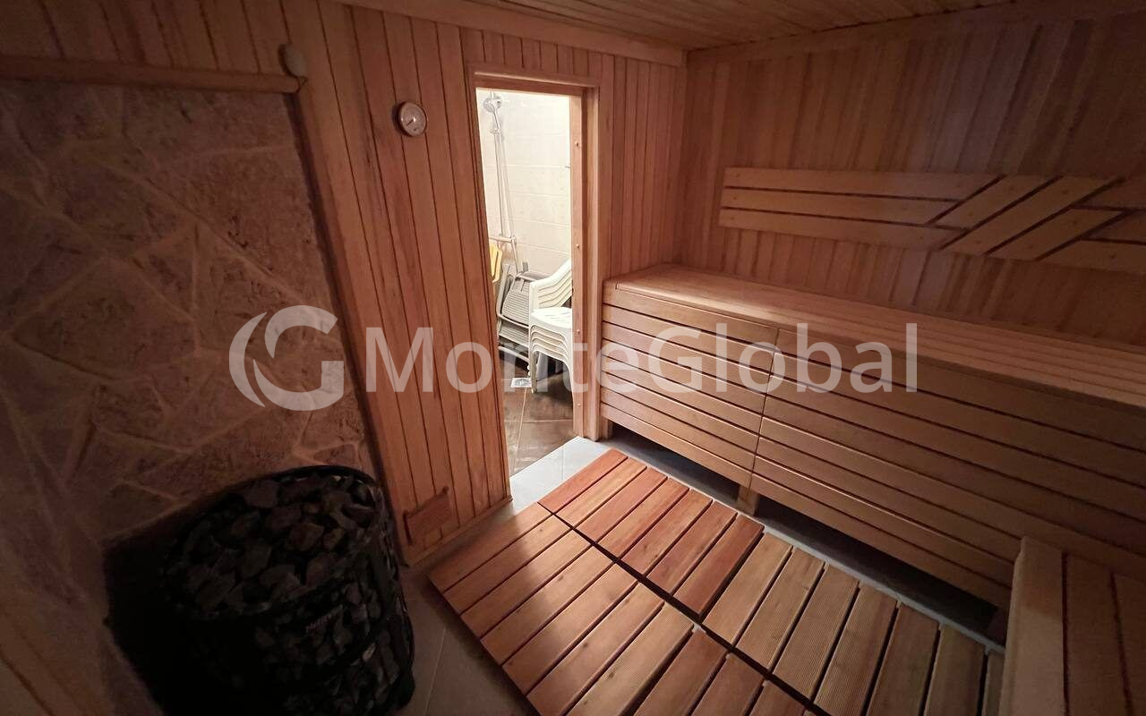 Im Erdgeschoss befindet sich ein Wellnessbereich mit finnischer Sauna, Dusche und Ruhebereich mit Tauchbecken.