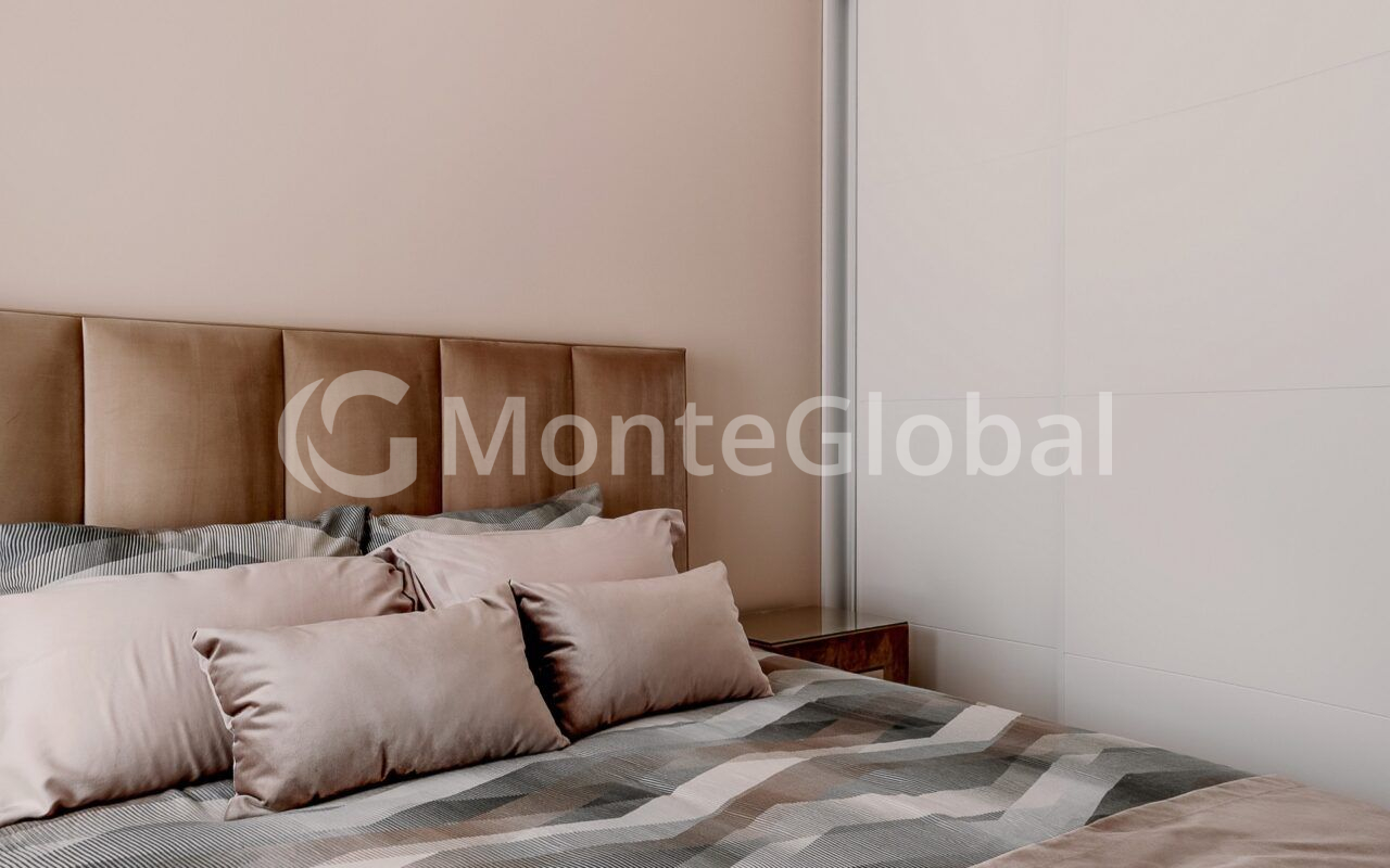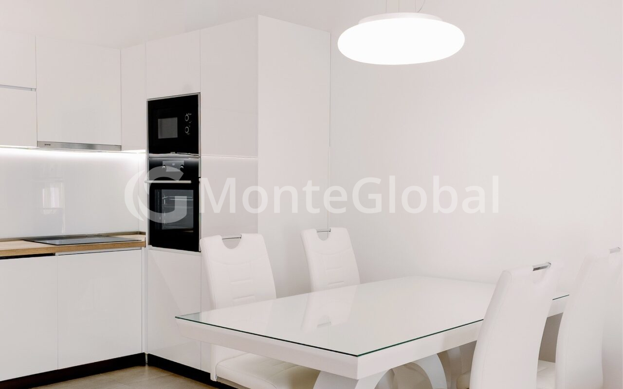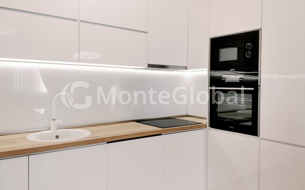 Die Küche ist aus hochwertigen MDF-Hochglanzmaterialien gefertigt und alle Schreinerarbeiten sowie die Schränke im Flur und in beiden Schlafzimmern vom Boden bis zur Decke sind aus hochwertigen MDF-Materialien gefertigt.