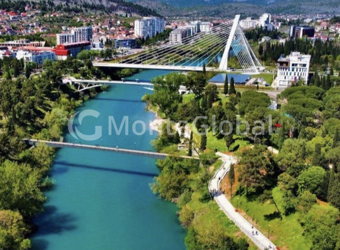 Das Gebäude wurde aus hochwertigen Materialien gebaut und ist von viel Grün umgeben, in der Nähe des Flusses Moraca und des Gorica-Hügels (Zagorica-Seite).